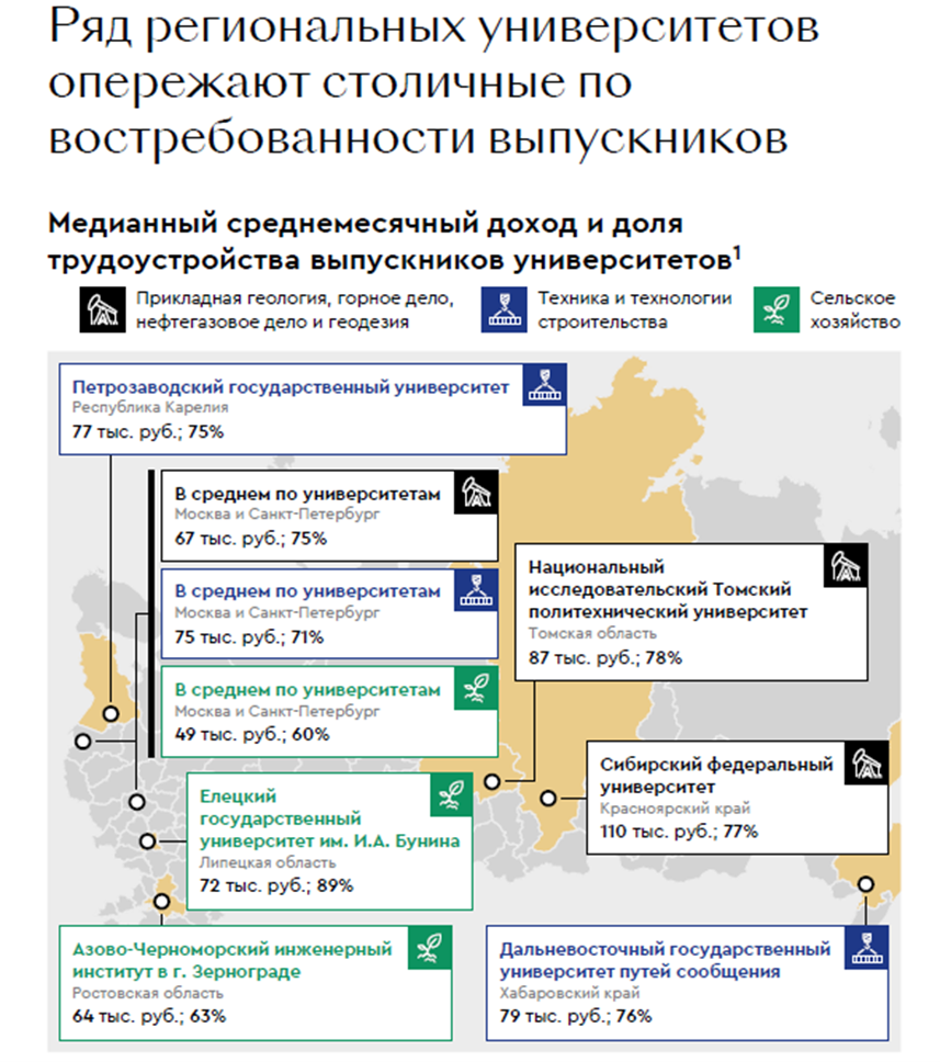 Любопытно, что выпускники региональных вузов и колледжей иногда зарабатывают больше, чем их коллеги, получившие ту же специальность в столичных учебных заведениях. Например, медианный доход выпускников Сибирского федерального университета по специальности «Прикладная геология» на 64% выше, чем у выпускников столичных вузов, подсчитали эксперты. При этом сильные колледжи, особенно в таких областях, как нефтегазовое дело и горное дело, могут дать своим выпускникам лучшие шансы на трудоустройство и высокие доходы, чем выпускники университетов, не входящих в топ-40 по востребованности.
