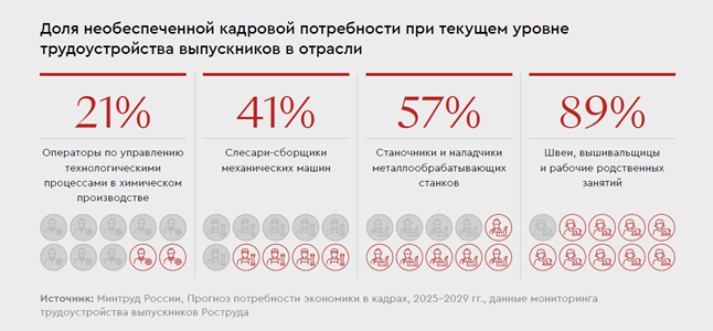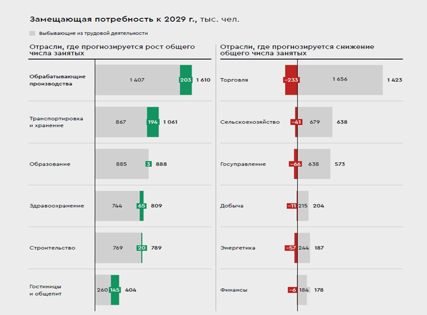 По оценкам экспертов, отрасль испытывает наибольшую потребность в замещении кадров среди всех секторов экономики — к 2029 г. потребуется 1,6 млн человек. При этом 1,4 млн человек необходимо лишь для восполнения кадрового баланса в связи с выбытием работников на пенсию, что обусловлено высоким средним возрастом занятых и низким уровнем притока новых специалистов в предыдущие периоды. Дополнительно 203 тыс. человек потребуются для покрытия спроса, связанного с созданием новых рабочих мест вследствие расширения производства, амбициозными целями по импортозамещению и технологическому суверенитету.